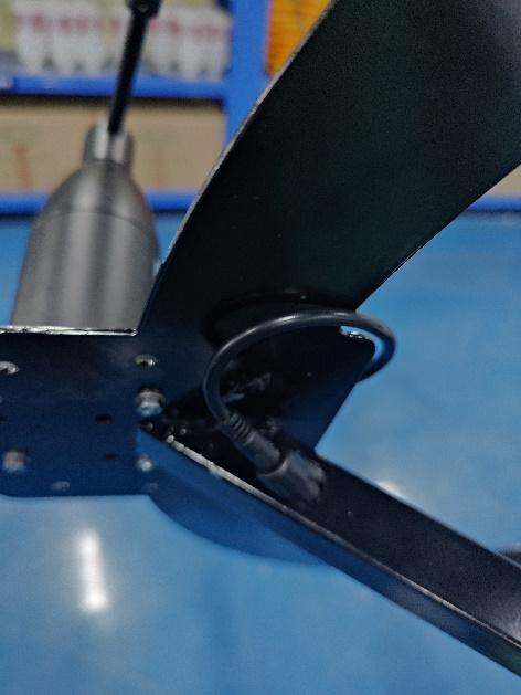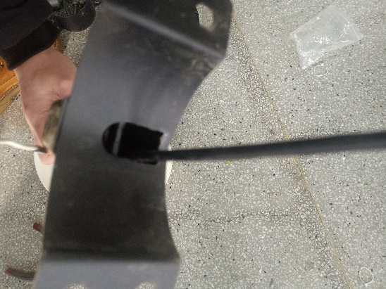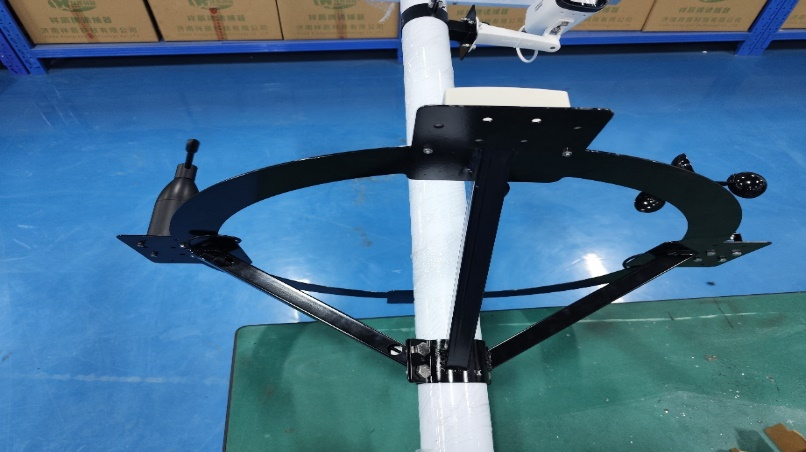 13、安裝固定圓盤支架并穿線,先將圓盤支架中間四個螺絲拆卸,然后將圓盤支架從燈桿上方套到燈桿上,光照傳感器朝向控制箱方向,將傳感器線從對應的進線孔(距燈桿頂端1m)穿進燈桿,從控制箱的出線孔(離燈桿底座1.2m)穿出燈桿,最后將圓盤支架4個穿線孔與燈桿的4個進線孔對齊,固定4個螺絲并擰緊,注意不要壓到線